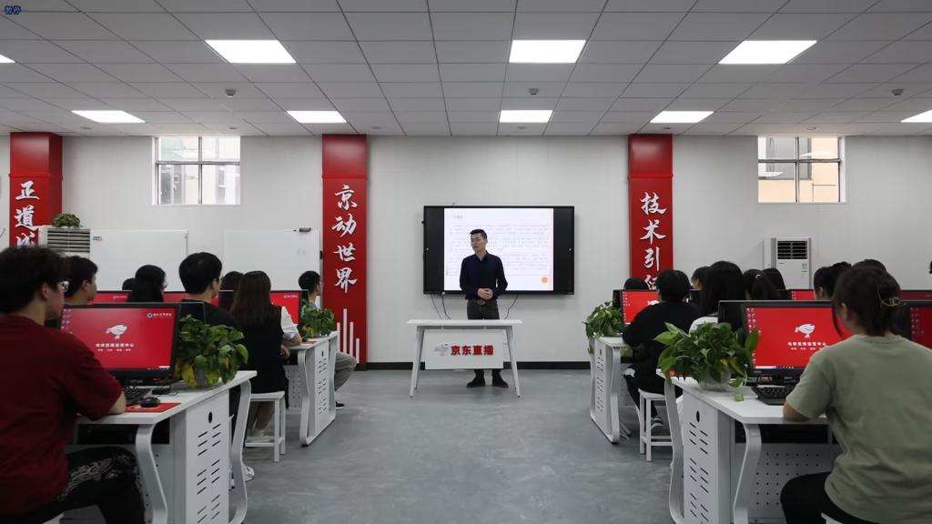 京东产教融合实训基地于2022年由京东旗下武汉京云创新科技有限公司承建,按照真实的职场办公环境进行布局,设有72个工位,安装有57台高配置、双网络覆盖的电脑,每年可接收80人次进行上岗操作实战。