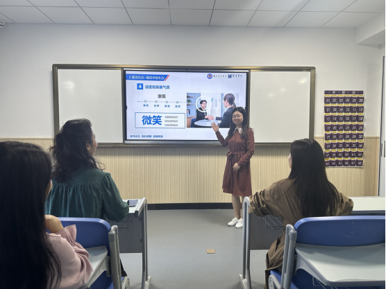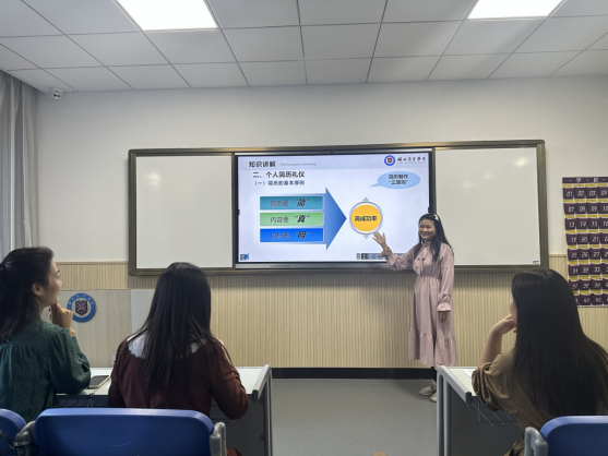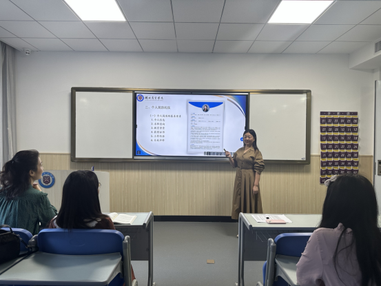 苏晓梦老师的示范课率先进行。苏老师课堂时间分配合理、生动有趣,在面试礼仪中通过实际的视频和图片引入相关问题,课程教学手段丰富,能很好的引发学习的兴趣。苏老师教态优雅大方、教学过程流畅、语言表达专业清晰、课件制作精美,非常值得学习。