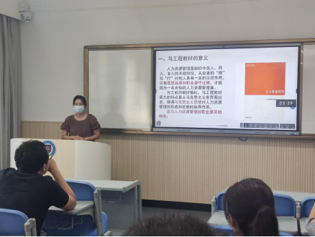 邹莹老师围绕《人力资源管理》课程,进行了《基于“马工程”教材的人力资源管理课程的探索》交流分享,从马工程教材的意义到课程目标和教学内容,充分诠释了“以价值观引领专业育人”和“润物细无声的隐性教育”的课程教育价值,邹莹老师娓娓道来的分享,也引发了老师们对所授课程的进一步思考,引起了大家对课程探索的共振。
