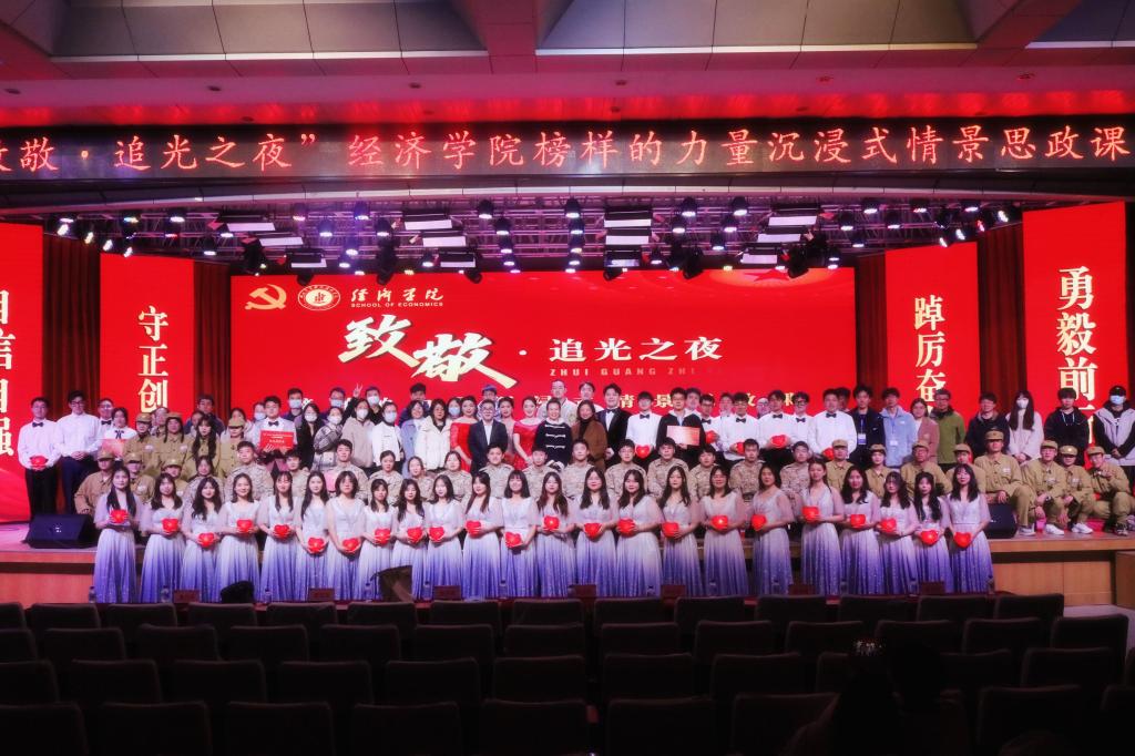 课程中,员工演绎团再现的抗美援朝战争中的英雄典型、“清澈的爱,只为中国”戍边战士陈祥榕、脱贫攻坚青春之花黄文秀等榜样人物的感人故事令现场近500名师生动容。最后,全场师生齐声发出青春宣言:用忘我的精神奉献社会,用进取之心建设家国,把我可爱的青春献给祖国最壮丽的事业!