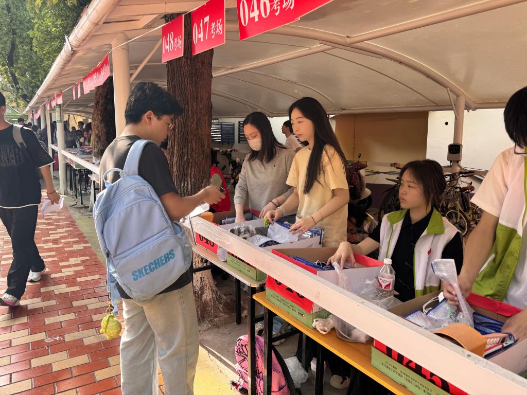 清晨六时,为确保考场周边秩序井然有序,王珉带领辅导员及员工志愿者团队在东一门与侧门设立了“秩序维护岗”。志愿者们身着统一服装,分工明确,引导考生有序排队、核验证件,并协助安保人员疏导交通,有效缓解了考点入口的拥堵状况。针对考生手机存放需求,设置了“手机保管区”,安排专人负责登记、编号、封装,确保手机安全无遗失。考试结束后,考生们纷纷表示:“手机存放流程清晰,老师们服务细致,让我们能更安心地投入考试。”