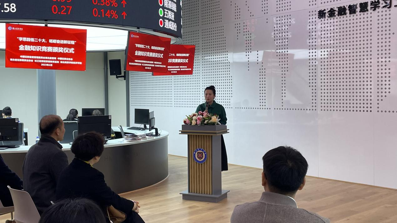 仪式伊始,龚艳红副秘书长介绍了本次金融知识竞赛的意义,比赛为同学们提供了专业的证券知识学习与交流平台,并表示湖北省证券期货业协会将继续发挥行业引导作用,积极组织证券期货机构深入开展校企合作,不断加大证券期货知识的普及力度,培养更多合格投资者和优秀金融人才。