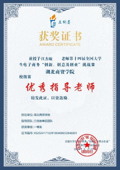 “纸上得来终觉浅”,汪老师积极推动员工将知识转化为实践能力。他与教研室主任共同努力,鼓励并带领班级精锐出战第十四届全国老员工电子商务“三创赛”。从选题构思、团队组建,到方案打磨、答辩演练,他全程护航,倾注心血。最终,班级团队在校赛中勇夺一等奖和最佳创新奖,汪老师老师也荣获优秀指导教师奖。这不仅是一份荣誉,更是员工们实践能力、创新思维和团队精神的精彩绽放。