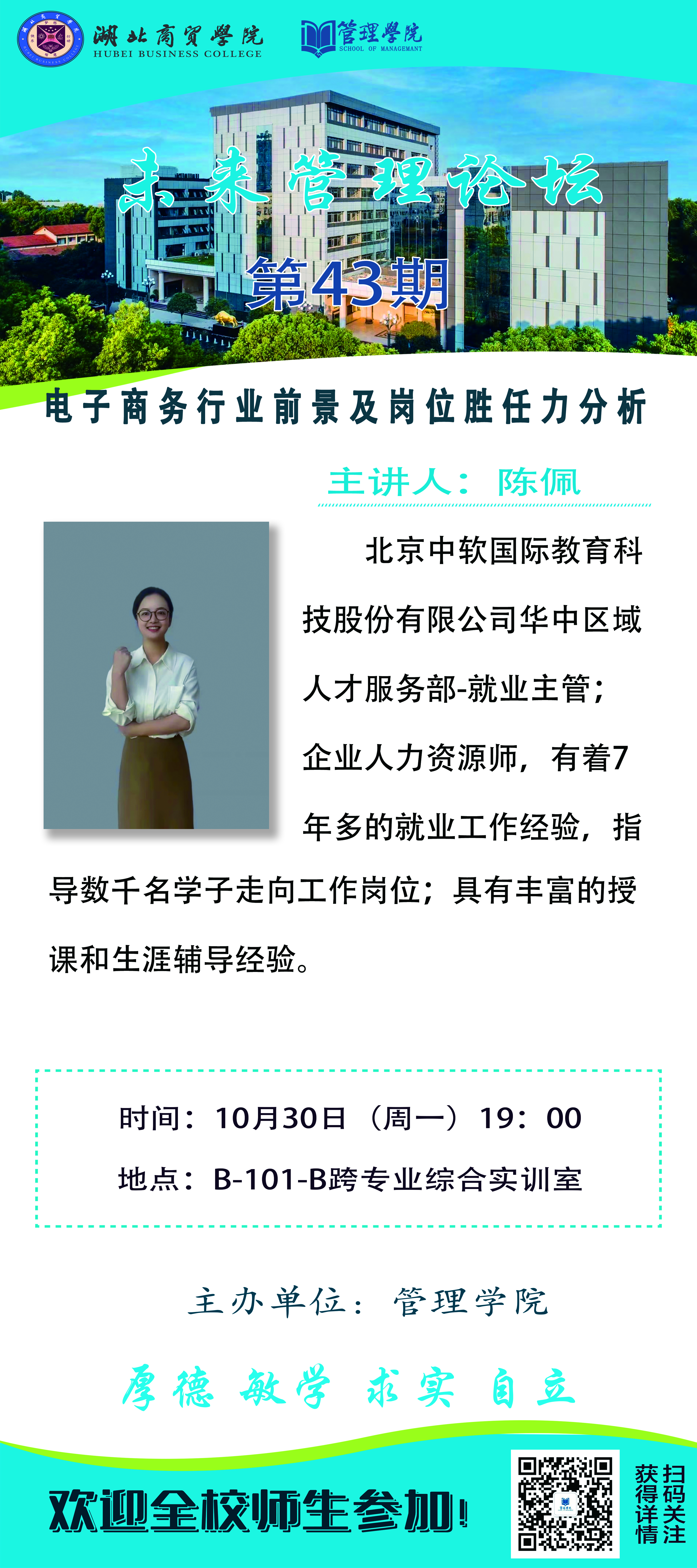 本期论坛邀请北京中软国际教育科技股份有限公司华中区域人才服务部-就业主管陈佩,主题是:电子商务行业前景及岗位胜任力分析。欢迎全校师生于10月30日(周一)下午19点00分做客B-101-B跨专业综合实训室。