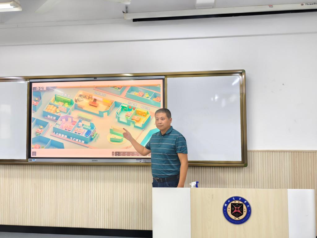 王性豪老师结合实训课程《企业沙盘模拟实训》进行磨课,借助屏幕上展示的企业模拟场景,生动展现企业运营各环节,帮助大家更好地理解企业管理实操要点。