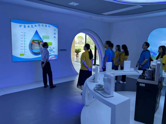 在参观完展示区域后,我们来到了园区中的水处理区域,优先看到了水生产的第一个区域“源水罐”,从地底160米抽出的矿泉水会优先存储到罐中进行水的缓冲与储备,并且还利用连通器原理可以实时的观察罐中水位确保安全。后来到生产车间,经过介绍这里的饮用水处理可以分为三个大步骤与若干小步骤。
