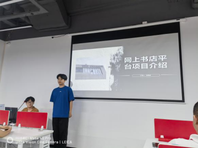 本次实习成果以项目答辩形式开展,员工上台进行PPT汇报并演示系统运行情况,校内外导师共同点评。员工们根据企业导师姚老师布置的项目,使用Python语言爬取图书数据,并对数据筛选、清洗及分析等,调用合适的数据嵌入到图书系统中,团队成员们结合“增、删、改、查”的功能逐次演示系统。