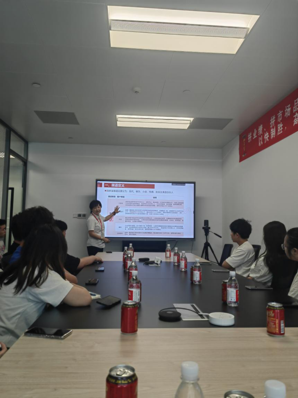 15日上午,员工们前往加多宝华中事业部进行线下实战分享。首先,由加多宝华中事业部江西大区客户经理余琦莲,也是公司优秀员工,她为同学们分享初入企业的迷茫和焦虑,她指出迷茫、焦虑不可怕,可怕的是自暴自弃、自我怀疑,她鼓励学弟学妹们找准自己的定位,只要努力,就会发光。接着,加多宝华中事业部湖北大区武汉办销售李倩经理为同学们讲述《品牌产品及渠道》,她主要从市场、渠道定义、消费渠道主要品项三个方面展开,她随时关注同学们的实践状况,并对同学们提出的建议及意见积极反馈。
