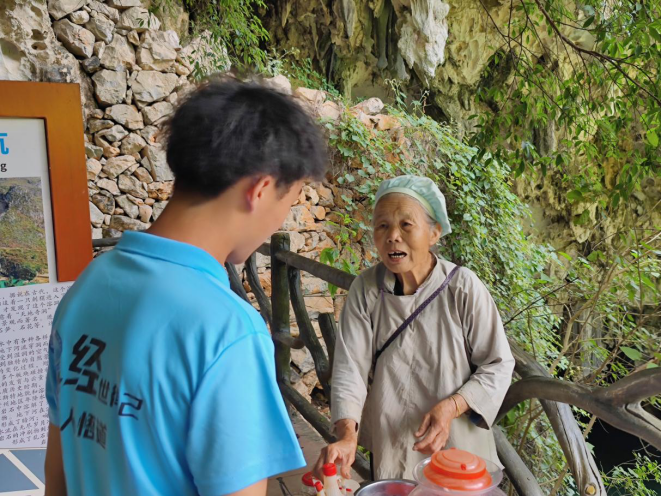 同样,通过团队成员采访得知,该地商贩普遍为留守老人,部分高龄商贩每天六点左右打包好两三箱饮品、酸萝卜、雪糕等,通过那陡峭山路,爬上山顶或者在半坡售卖,十分辛苦。在与商贩的交流中,团队成员深刻感受到她们对这片土地的热爱和对生活的执着。即便山路很难走,很难爬,她们依旧坚持将食物带上去售卖,价格也相对平价,就连冰柜也是她们自己一步步背上山的。