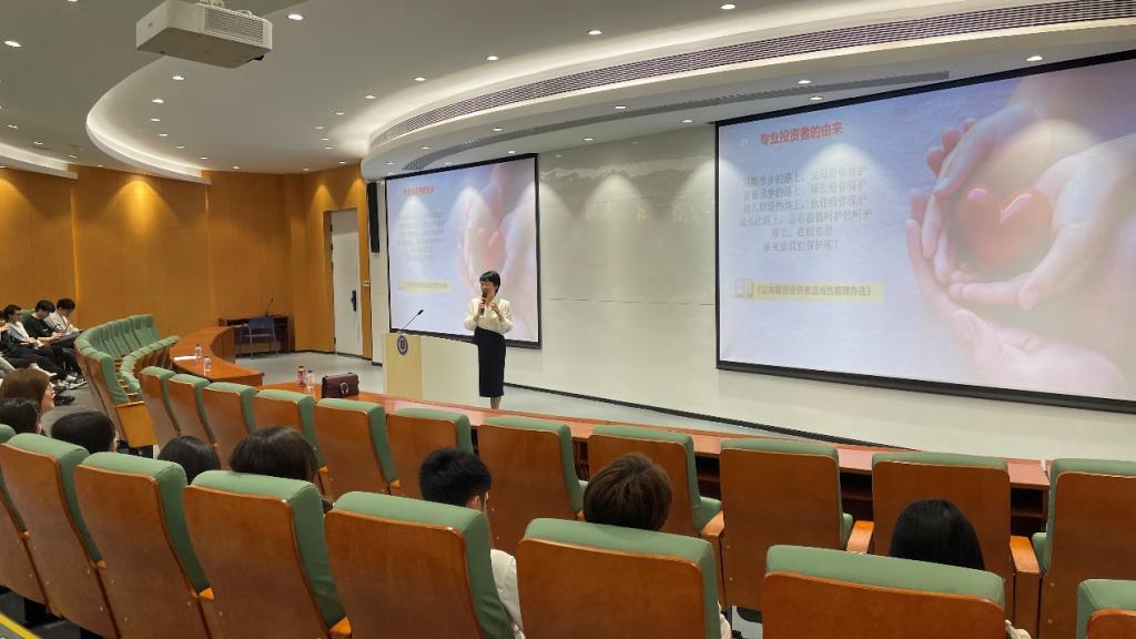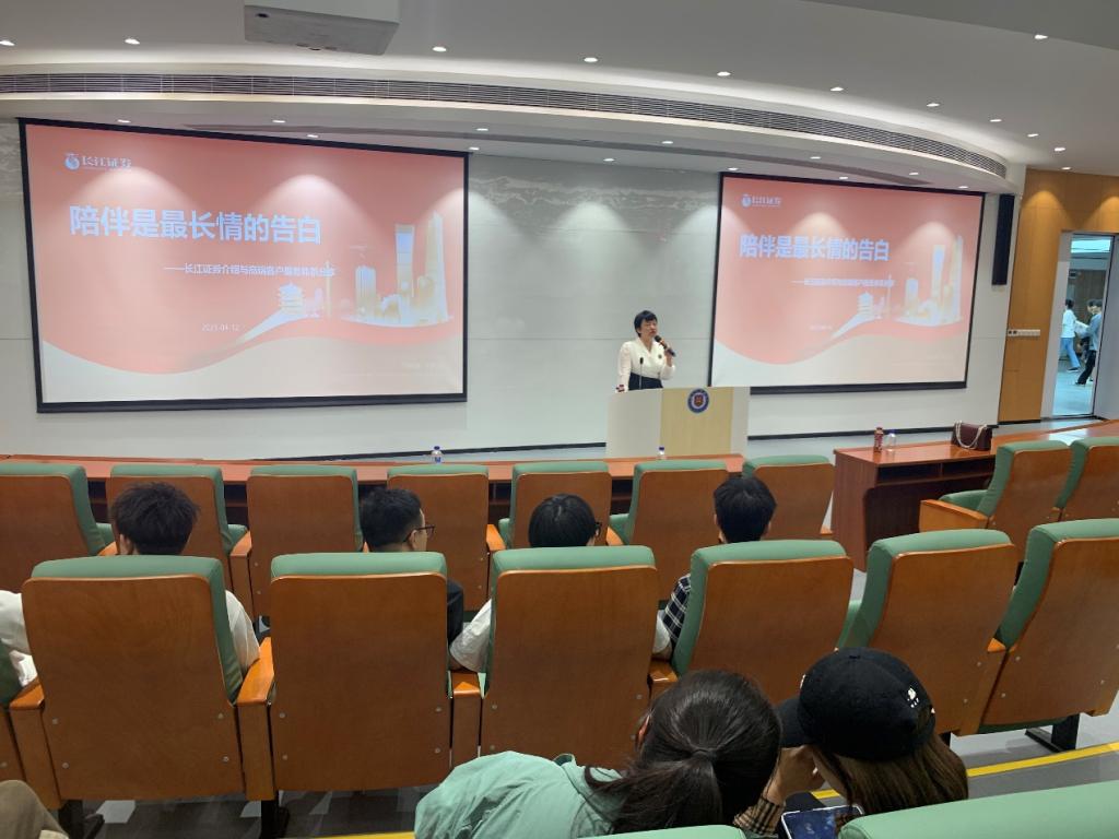 2023年4月12日下午,“经济讲坛”系列活动之“企业实践讲座”在鸿博楼J1报告厅举行,长江证券财富管理中心总经理助理王琦带来了“高端客户服务,陪伴财富之旅”的专题讲座,21级金融专业员工参加了本次活动,活动由金融教研室刘少田老师主持。